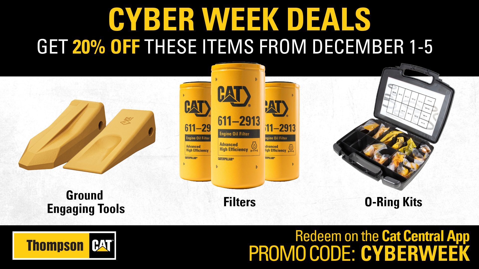 We know how important it is to find savings during the holiday season, so we’ve made it easy for you. For just five days, you can get 20% off G. E. T. (Ground Engaging Tools), Filters, and O-Ring Kits! Between December 1-5, fill your cart at Parts.Cat.Com and save big.